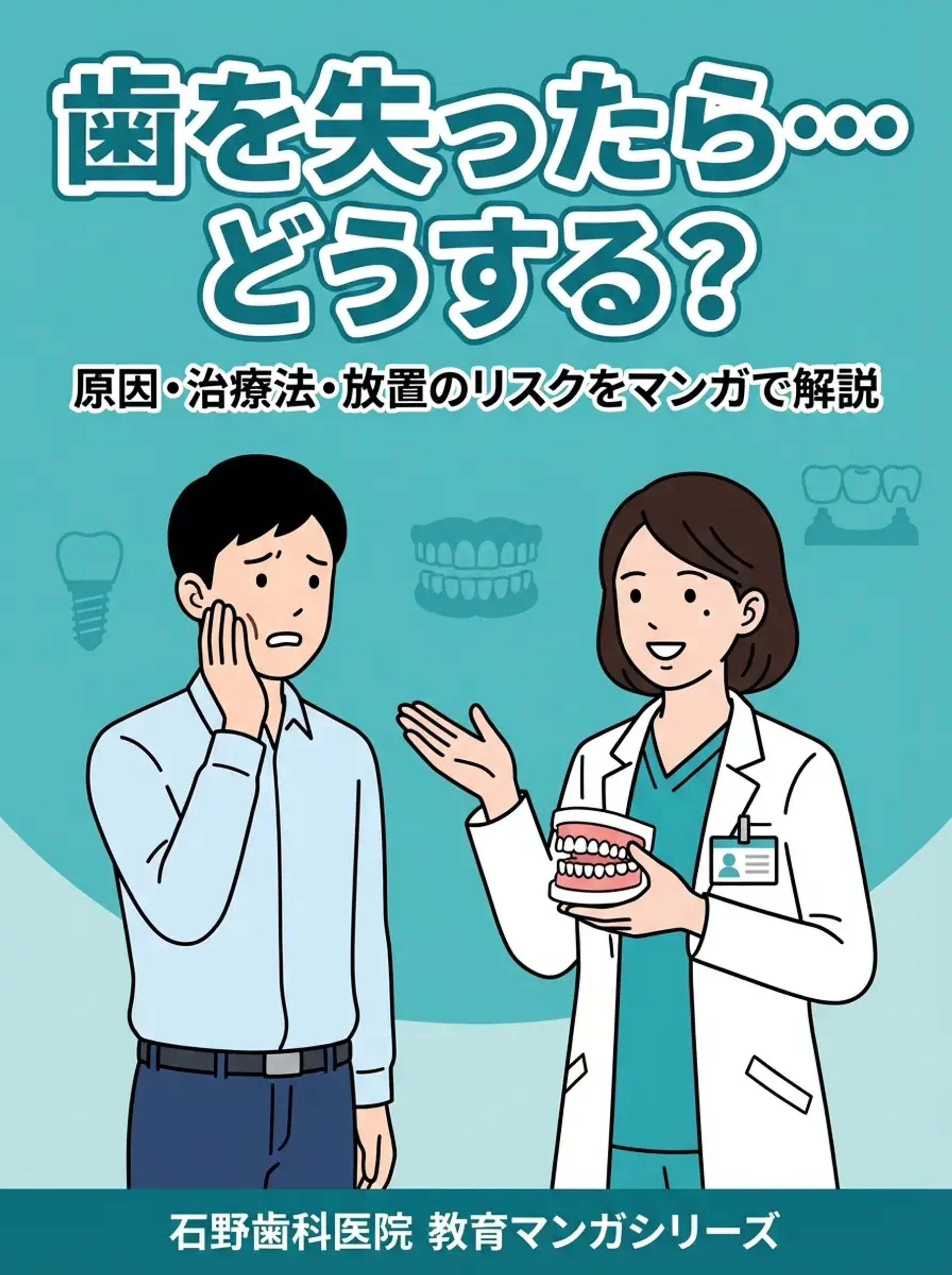 歯が抜けてしまったらどうすればいいの? そのまま放置しても大丈夫? 今回は石野歯科医院(天王寺区・四天王寺前夕陽ヶ丘)の歯科医師が、 歯を失う原因・3つの治療法・放置した場合の9つのリスクをわかりやすく解説します。