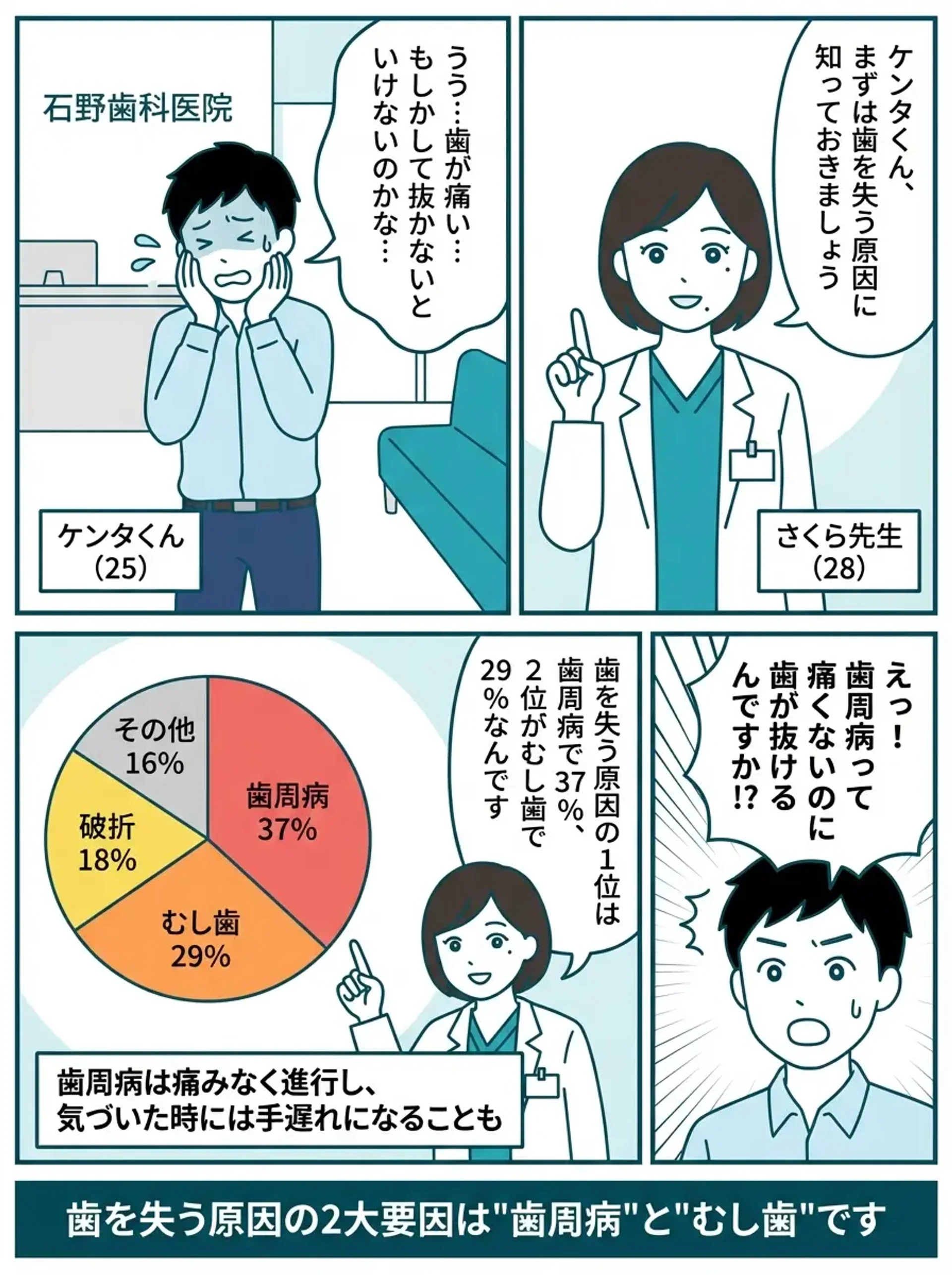 さくら先生とケンタくんが歯を失う原因・治療法(インプラント・入れ歯・ブリッジ)・放置のリスクをわかりやすく解説します。音声ガイド付き